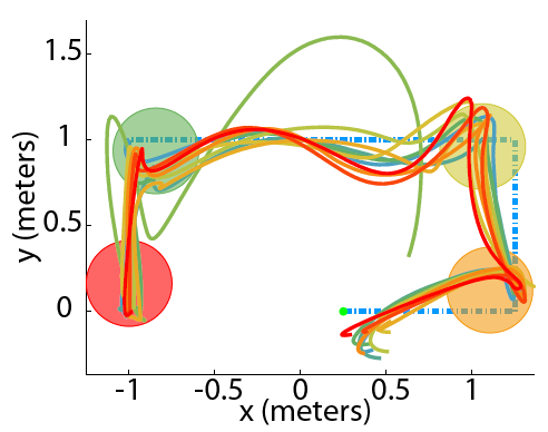 Most recently, we demonstrated successful aerobatic maneuvers with theoretical guarantees on safety. To successfully complete a backflip maneuver we analyzed the system to provide conditions on the quadrotor's state that ensured, even with disturbances, it could safely return to a stable hovering condition. This was accomplished by modeling the quadrotor in a hybrid dynamics framework for the design of guaranteed safe switching regions which were constructed using reachable sets calculated via a Hamilton-Jacobi differential game formulation. A video explanation is shown below on the right.