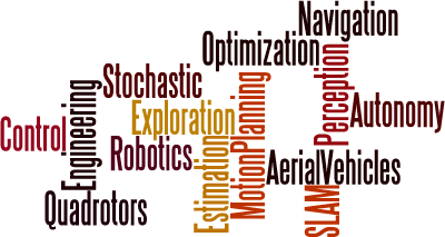 decentralized collision avoidance, stochastic and deterministic motion planning, sensor placement, autonomous landing and robust controller synthesis.